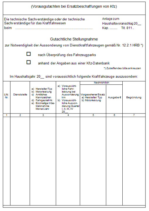 Bei Ersatzbeschaffungen ist eine gutachterliche Stellungnahme (Vorausgutachten) nach Beispiel 26 der oder des Technischen Sachverständigen für das Kraftfahrtwesen über die Notwendigkeit der Aussonderung zu erstellen (siehe VV Nummer 8 zu § 63 BHO). Bei personengebundenen Dienstkraftfahrzeugen und wenn das Dienstkraftfahrzeug der sogenannten Jahreswagenregelung unterliegt, kann auf die Erstellung der gutachterlichen Stellungnahme verzichtet werden (vergleiche im Einzelnen Rundschreiben BMF vom 29.11.2023 - II A 2 - H 1261/21/10002 :001, GMBl. 2023, 1127 ff).Den Voranschlägen ist eine Erklärung beizufügen, dass erforderliche Gutachten über auszusondernde Kraftfahrzeuge vorhanden sind und auf Anforderung vorgelegt werden können. - 12.2.2