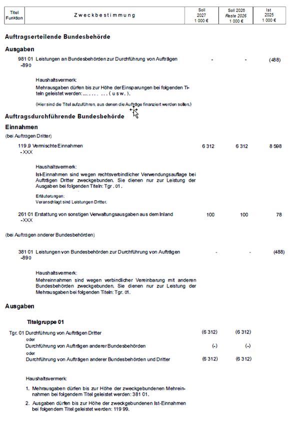 - Durchführung von Aufträgen anderer Bundesbehörden und DritterFür die Darstellung der Veranschlagung von Einnahmen und Ausgaben im Zusammenhang mit der Durchführung von Aufträgen anderer Bundesbehörden und Aufträgen Dritter gilt Beispiel 27.Verrechnungstitel sind aus systematischen Gründen immer als nicht der Bereichsausnahme unterfallend zuzuordnen.Bei der Durchführung von Aufträgen anderer Bundesbehörden und bei Aufträgen Dritter in Einzelplänen oder Kapiteln, die grundsätzlich vollständig unter eine Kategorie der Bereichsausnahme fallen (Verrechnungstitel 381 .1/981 .1), werden die entsprechenden Ausgabetitel nicht der Bereichsausnahme zugeordnet.