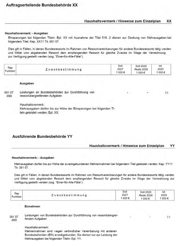 - Einer-für-alle-FälleUnter „Einer-für-alle-Fälle“ sind Fälle zu verstehen, in denen ein Bundesressort im Rahmen von Ressortvereinbarungen für andere Bundesressorts tätig wird und Mittel vom abgebenden/beauftragenden Ressort dem empfangenden/auftragsdurchführenden Ressort für gleiche Zwecke im Wege der Verrechnung zur Verfügung gestellt werden. Es findet keine Verrechnung von Kosten, sondern ausschließlich von Ausgaben statt und die Verrechnung ist nur zwischen einzelnen Ressorts möglich. Weiterhin hat also das beauftragende Ressort für die ausreichende Veranschlagung entsprechender Haushaltsmittel Sorge zu tragen.Beim Auftrag erteilenden Ressort wird bei Kapitel ..11 ein Titel 981 07 „Leistungen an Bundesbehörden zur Durchführung von ressortübergreifenden Aufgaben“ eingerichtet und beim ausführenden Ressort ein Titel 381 07 „Leistungen von Bundesbehörden zur Durchführung von ressortübergreifenden Aufgaben“ sowie die jeweils korrespondierenden Ausgaben-Vermerke im jeweiligen Einzelplan (vergleiche Beispiel 28).Diese Titel sind auch zu verwenden, wenn erforderliche Titel beziehungsweise Haushaltsvermerke gemäß Nummer 14.1 noch nicht vorhanden sind.