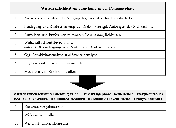 C. | Die wesentlichen Arbeitsschritte einer Wirtschaftlichkeitsuntersuchung in der Planungsphase einer finanzwirksamen Maßnahme |